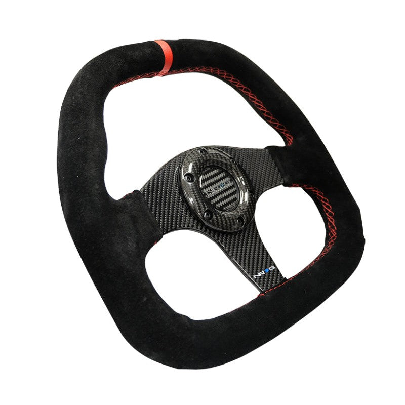 NRG Carbon Fiber Steering Wheel (320mm) Flat Btm. Blk Suede/Red Stitch w/CF Spokes & Red Center Mark