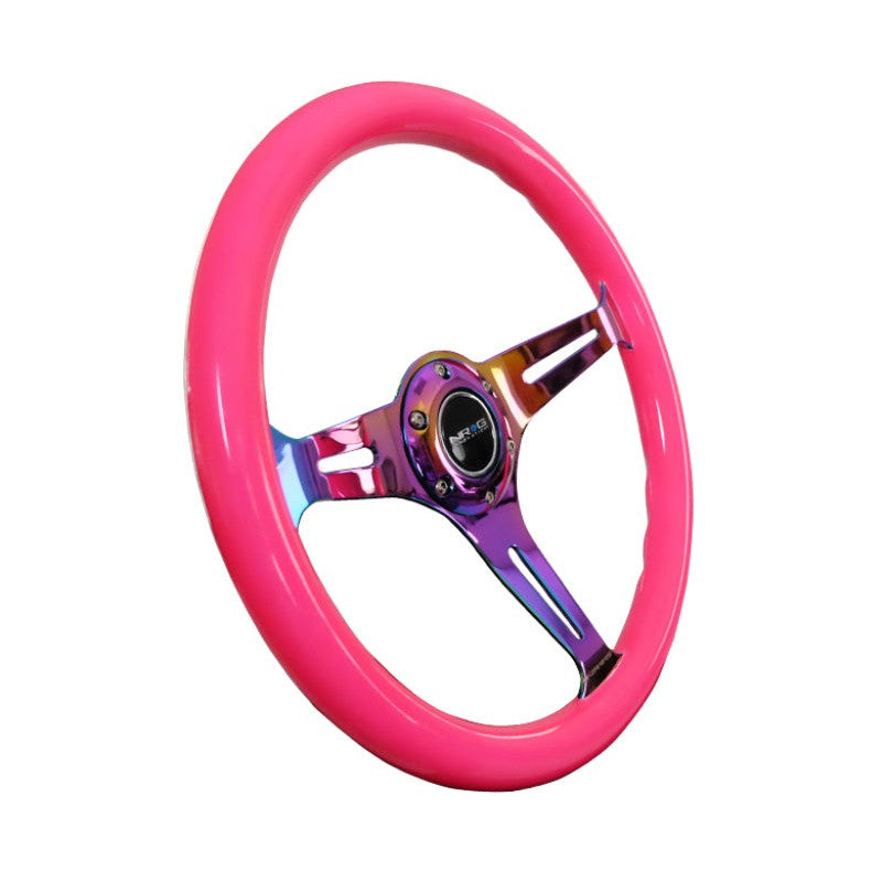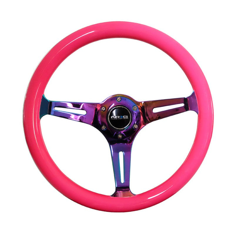 NRG Classic Wood Grain Steering Wheel (350mm) Neon Pink Painted Grip w/Neochrome 3-Spoke Center