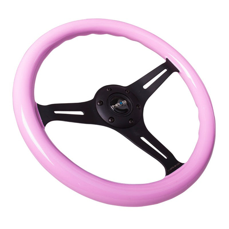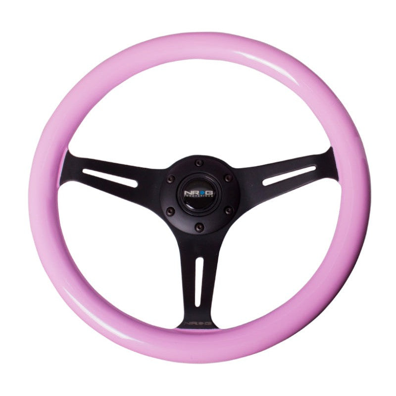 NRG Classic Wood Grain Steering Wheel (350mm) Solid Pink Painted Grip w/Black 3-Spoke Center