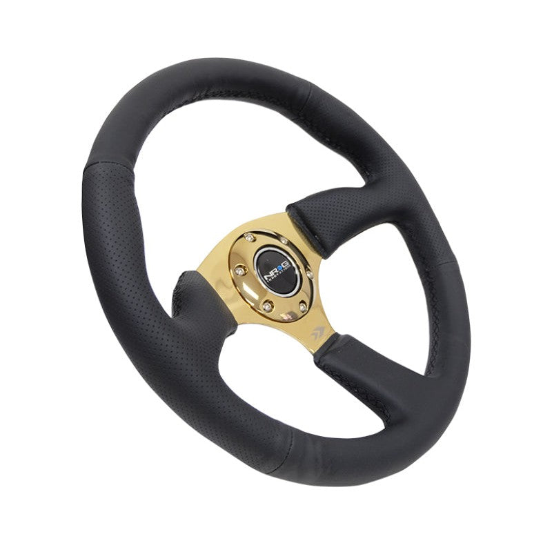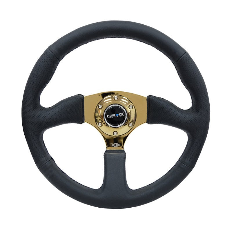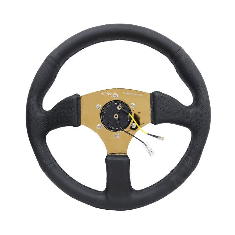 NRG Reinforced Steering Wheel (350mm / 2.5in. Deep) Leather Race Comfort Grip w/4mm Gold Spokes