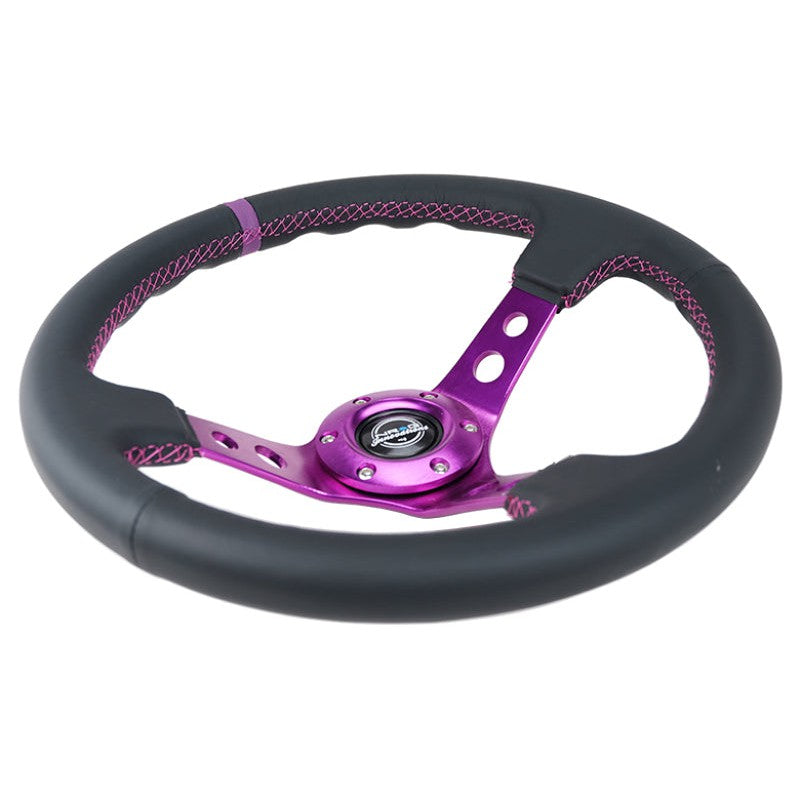 NRG Reinforced Steering Wheel (350mm / 3in. Deep) Black Leather w/Purple Center & Purple Stitching