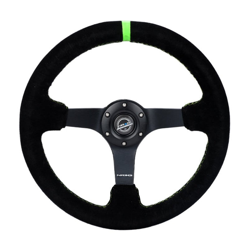 NRG Reinforced Steering Wheel 350mm/3in. Deep Blk Suede/ Neon Green Stitch w/5mm Matte Black Spoke