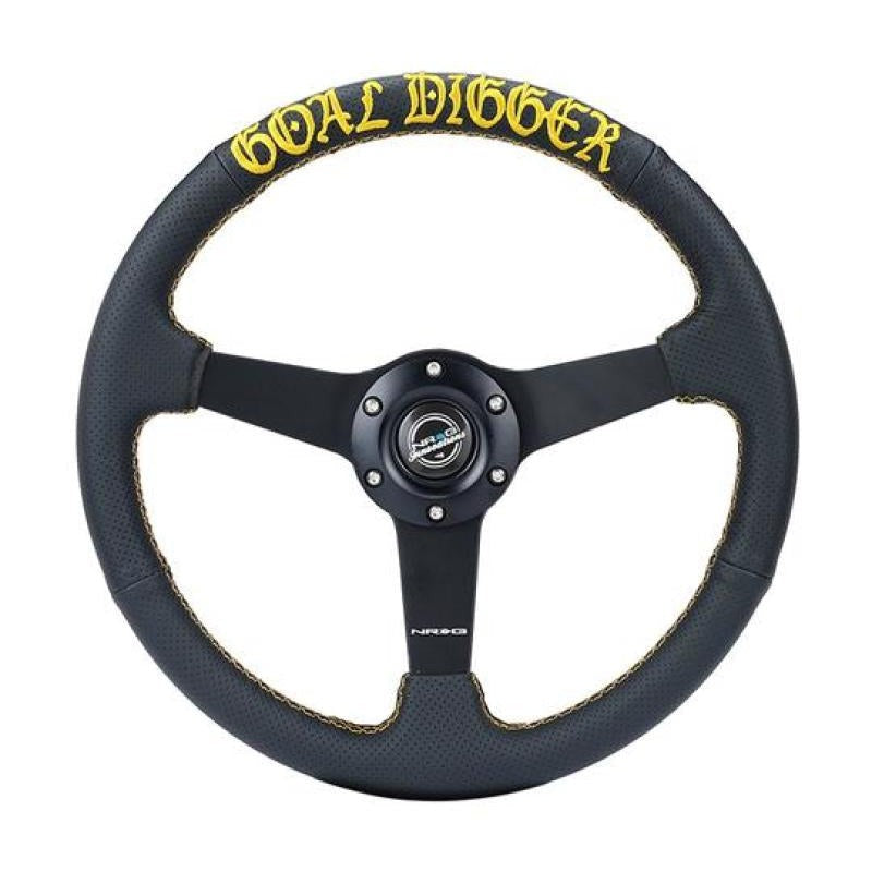 NRG Sport Steering Wheel (350mm / 1.5in Deep) Black Leather/Gold Stitch w/Matte Black Solid Spokes