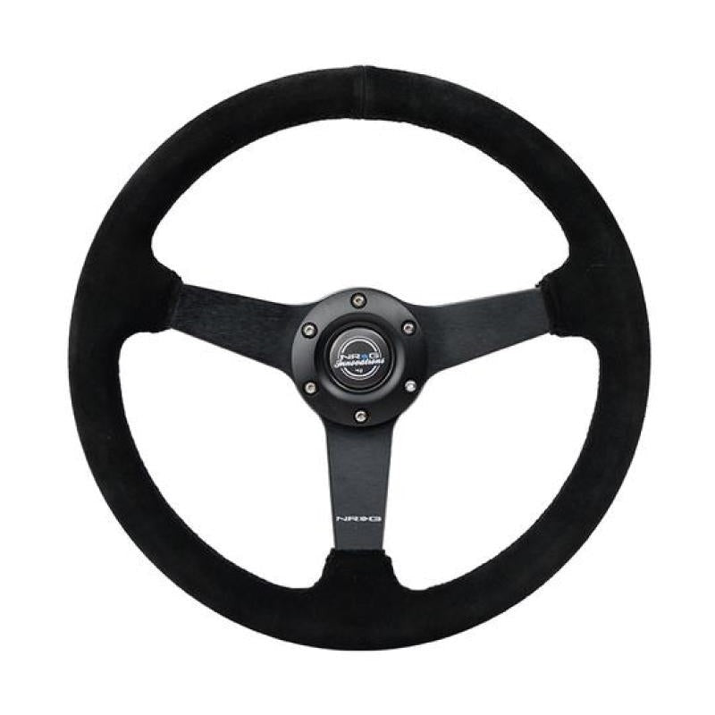 NRG Sport Steering Wheel (350mm / 1.5in Deep) Black Suede/Black Stitch w/Matte Black Solid Spokes
