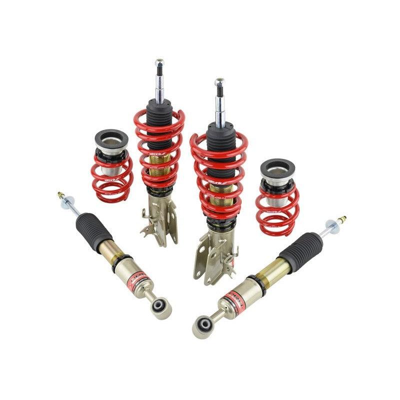 You asked for it, and we listened. Skunk2's Pro-S II Coilovers for the '06-'11 Civic now feature softer, 8 kg/mm spring rates and one- in. shorter shock bodies up front for a more comfortable and even lower ride height. The results are a full three- in. drop all the way around and high-performance handling without sacrificing comfort. Similar to Skunk2's industry-leading Pro-C Coilovers, Pro-S II Coilovers feature adjustable ride height and a state-of-the-art mono-tube design. Thanks to threaded shock bodies, Pro-S II Coilovers now offer height adjustments independent of spring preload, which results in significant ride-height changes without sacrificing shock travel or ride comfort. Quick and precise ride-height adjustments can now be made for dialing in corner balancing as well as for improved handling, responsiveness, and overall balance. Skunk2's track- and street-tested Pro-S II shock valving offers the perfect balance between daily driving and track performance and its all-new, shortened shock bodies and reduced shaft strokes help maintain adequate suspension travel on lowered vehicles for improved performance without sacrificing comfort. Pro-S II Coilovers feature vehicle-specific valving dialed in by Skunk2's suspension engineers, carefully selected springs designed to dramatically improve handling, and a race-inspired, mono-tube design for superior performance. Skunk2's micro-polished, mono-tube design, combined with its precision-machined, oversized shafts and pistons, ensure that each Pro-S II Coilover is both responsive and durable. The results are unmatched cornering grip, reduced body roll, and a feel of vehicle control and stability like no other. Like all Skunk2 Coilovers, its Pro-S II Coilovers feature hard-anodized, CNC-machined, forged 6061-T6 aluminum spring perches and CNC-wound racing springs manufactured from high-quality, SAE9254V spring steel.