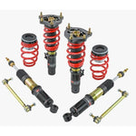 Engineered to racing specifications, tested and proven over decades on winning racing teams. Integrating the highest-level technologies into an affordable street-spec coilover, our systems are a perfect, affordable solution for your daily driven performance vehicle. Built with daily driven sports cars in mind, our Pro-ST shock absorbers are shorter than factory, lowering the vehicle approximately 3- inches while still retaining full shock travel. This, coupled with the 12-way damping adjustability and stiffer springs, allows you to adjust to the perfect setting for the driving environment. Large 52mm seamless carbon steel mono-tube shock bodies provide strength and provide room for a larger hydraulic piston and valves, more shock oil, and an enlarged nitrogen chamber. All of these upgrades add up to huge jumps in compression and rebound response, vastly improved handling characteristics, and extreme durability even in the harshest of conditions. Externally, the shock bodies are threaded along their length to fit spring preload adjustment collars and the internally threaded lower shock mount and collar. This allows for independent changes in ride height and spring preload, giving the ability to tune each corner's weight to achieve optimal 4-wheel corner balance without sacrificing ride quality. Additionally, the shock body and threads are protected from the elements with gold-colored zinc electroplating. After rigorous testing, we chose to fit linear rate springs instead of progressive. Featuring spring rates of 10kg/mm up front and 8kg/mm in the rear, the linear spring offers more consistency under all different measures of weight loading while cornering and hitting bumps. This offers the most predictable vehicle feedback in all driving situations. Each spring is made from the highest quality AE9254V Chrome Vanadium forged to work with our oil-nitrogen filled strut to provide the greatest possible balance of street and track performance.