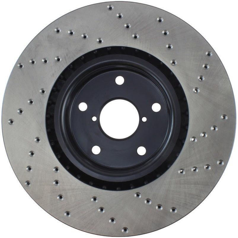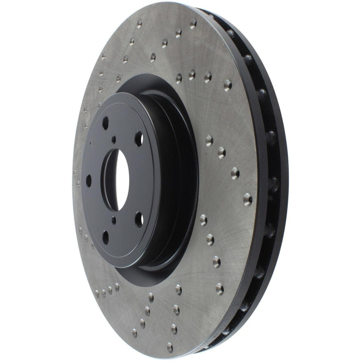 StopTech Drilled Sport Rotors are 1-piece direct replacement brake discs for factory brake systems and stock calipers that look great behind your wheels – and offer significantly improved braking performance. The unique cross-drilling aids with heat and brake dust dispersal; prevents glazing of the pads; adds bite and improves wet and dry braking performance. Built to last; the black e-coating provides protection from corrosion and the high carbon metallurgy (in most applications) offers quieter operation; better crack resistance and increased performance.